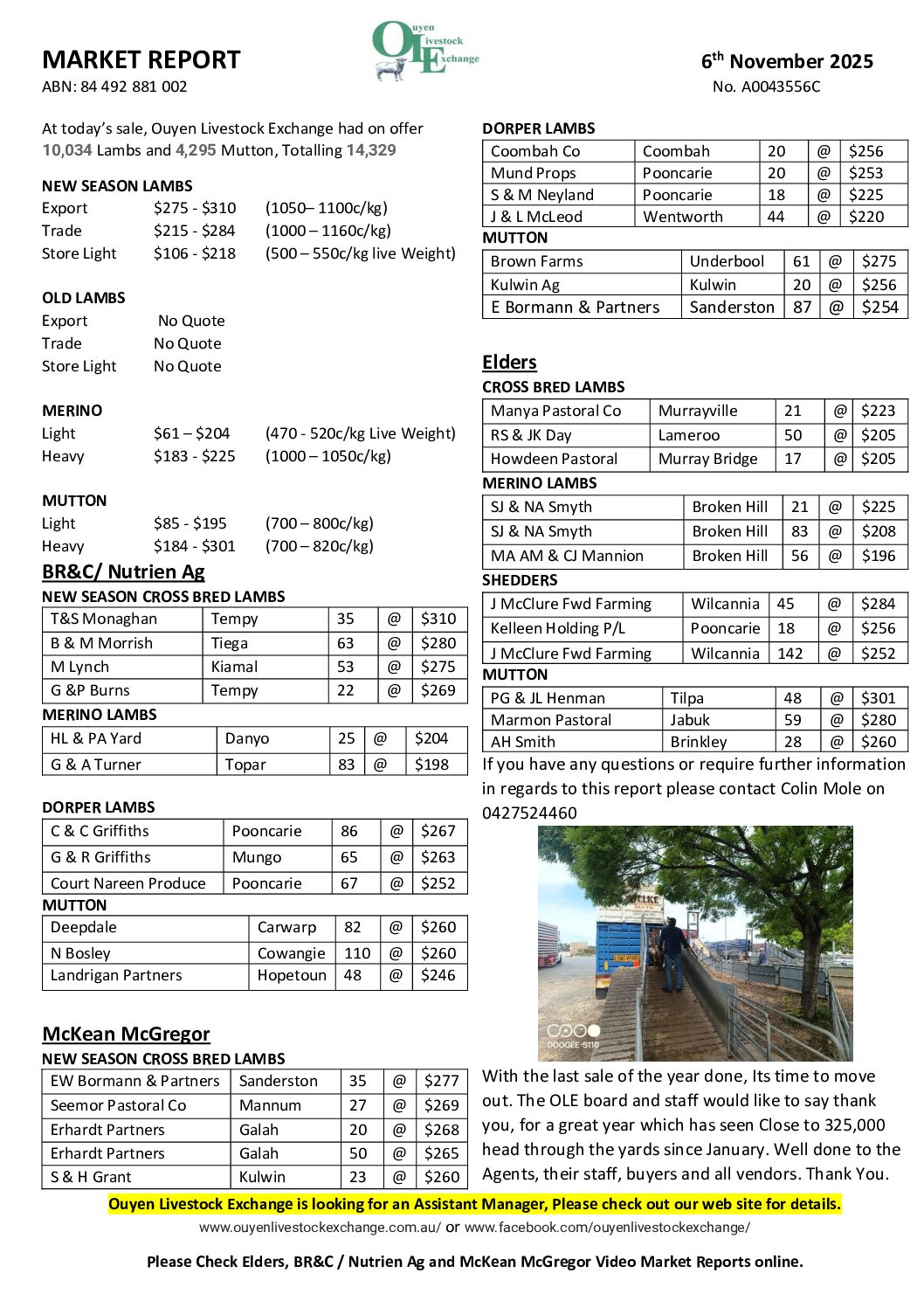 Ouyen Livestock Exchange Sheep Reports All data provided by Report Date: 6th November 2025 Total Yarding: 14,329 Summary At today’s sale, Ouyen Livestock Exchange had on offer 10,034 Lambs and 4,295 Mutton, Totalling 14,329 Full ReportÂ